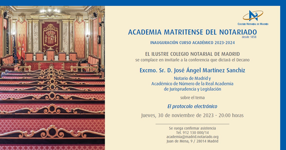 El Decano del Colegio Notarial de Madrid, Excmo. Sr. D. José Ángel Martínez Sanchiz, Notario de Madrid y Académico de Número de la Real Academia de Jurisprudencia y Legislación, inaugura el jueves día 30 de noviembre el Curso Académico 2023-2024 de la Academia Matritense del Notariado pronunciando la conferencia "El protocolo electrónico".