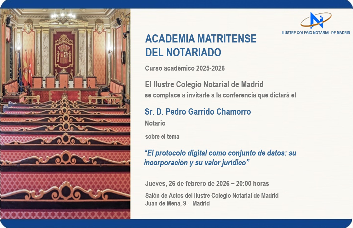 El jueves día 26 de febrero de 2026, a las 20.00 horas, tendrá lugar en el Salón de Actos del Colegio, la conferencia del Curso Académico 2025-2026, que pronunciará el Sr. D. Pedro Garrido Chamorro, Notario, sobre el tema "El protocolo digital como conjunto de datos: su incorporación y su valor j...