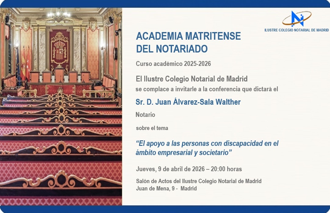 El jueves día 9 de abril de 2026, a las 20.00 horas, tendrá lugar en el Salón de Actos del Colegio, la conferencia del Curso Académico 2025-2026, que pronunciará el Sr. D. Juan Álvarez-Sala Walther, Notario, sobre el tema "El apoyo a las personas con discapacidad en el ámbito empresarial y societ...