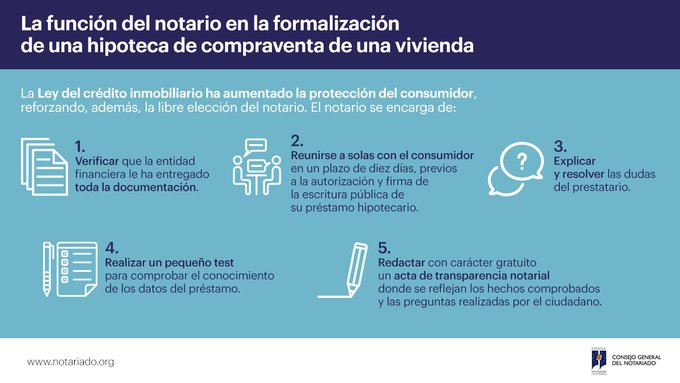 Desde la aprobación de la norma, la compra de una vivienda con préstamo hipotecario exige la intervención de un notario, siempre elegido por el ciudadano, en la fase previa a la contratación del préstamo con una entidad bancaria, con la finalidad de que el comprador pueda conocer al detalle en qué consiste la financiación y su responsabilidad hipotecaria.