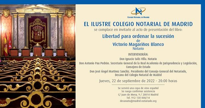 El próximo jueves 22 de septiembre, a las 20:00 horas, en el Salón de Actos del Colegio Notarial de Madrid (entrada por C/ Juan de Mena nº 9), el Notario D. Victorio Magariños Blanco presentará su libro "Libertad para ordenar la Sucesión".